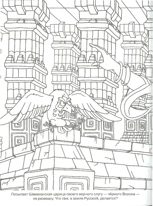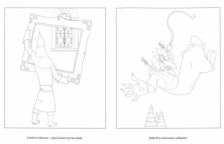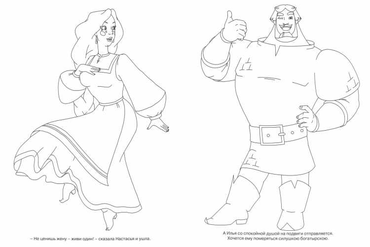 Книжка содержит более 20 уникальных иллюстраций, на которых изображены главные герои мультфильма: богатыри Илья Муромец, Добрыня Никитич и Алеша Попович, а также красавица-царица и её коварный брат. Каждая картинка сопровождается цитатой из мультфильма, что делает процесс раскрашивания ещё более интересным и позволяет детям вспомнить любимые моменты из фильма.