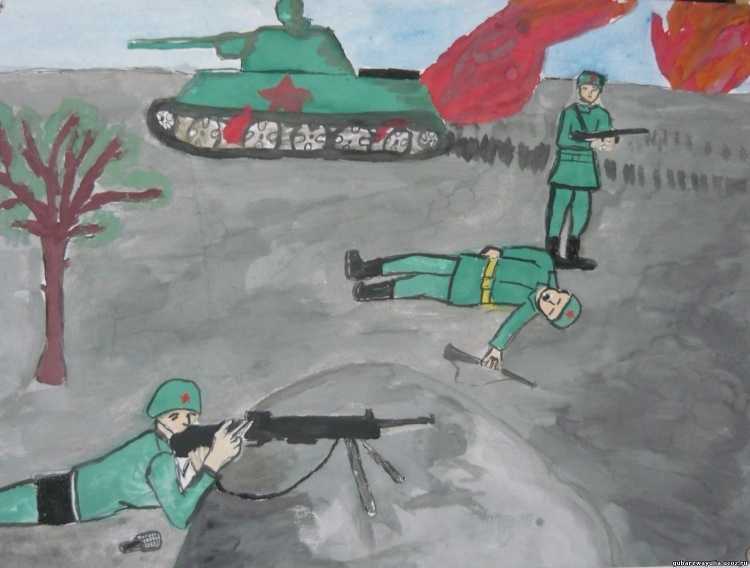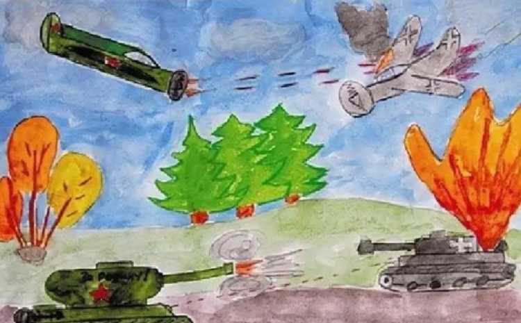 3. Рисунки оружия и военной техники того времени, включая танки, самолеты и артиллерию.