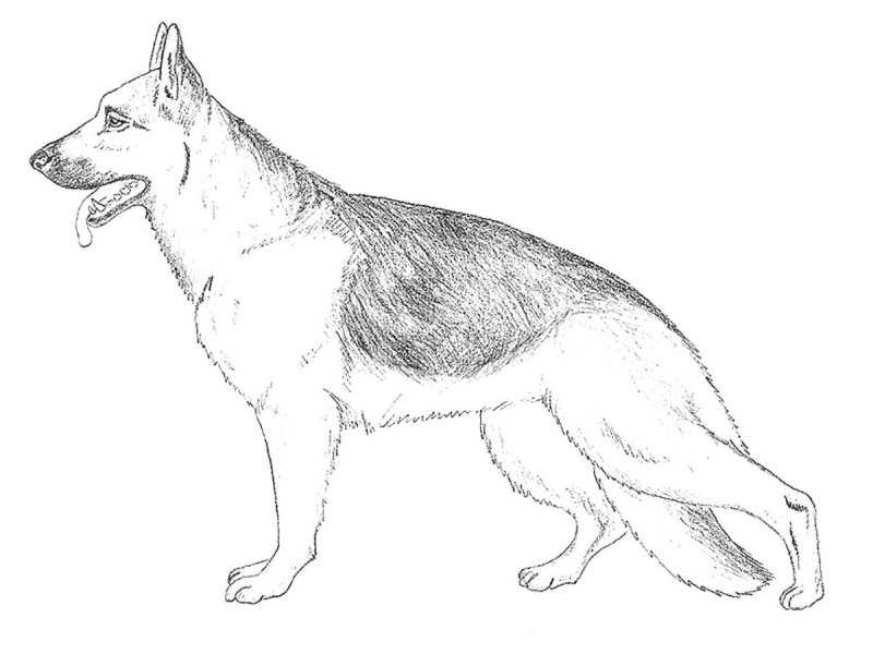 Сначала нарисуйте контуры тела овчарки, учитывая её стройность и мускулистость. Лапы и хвост должны быть анатомически точными.