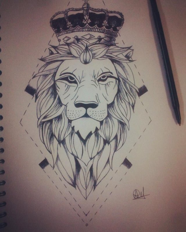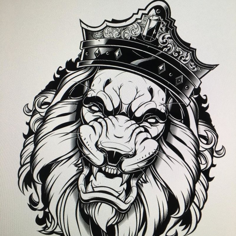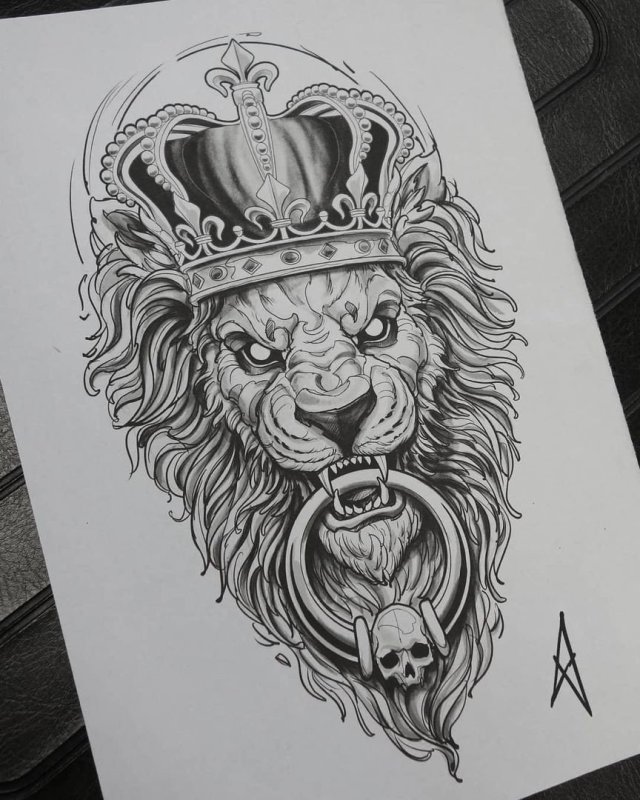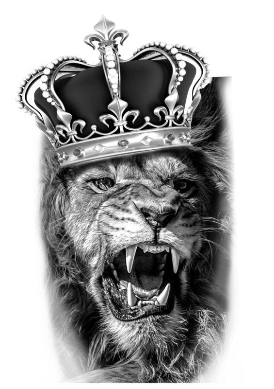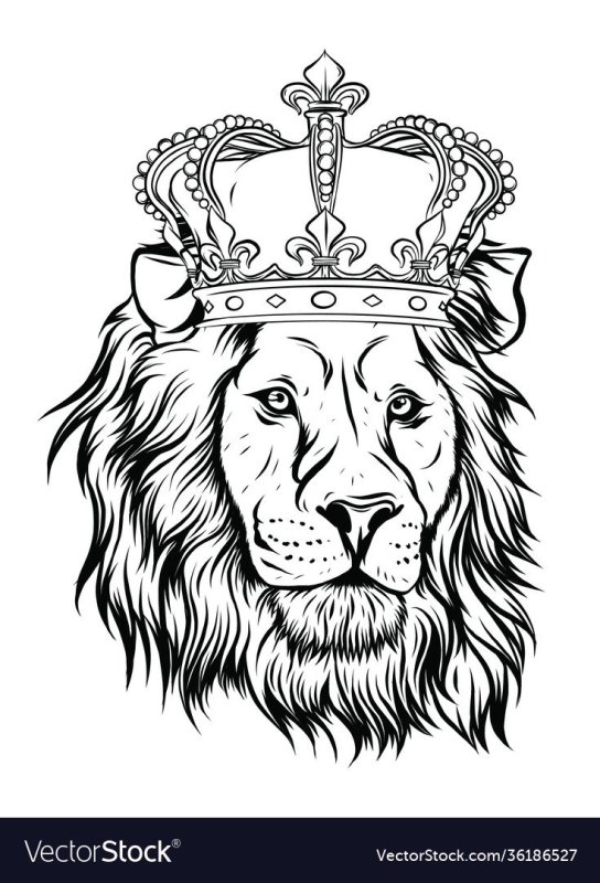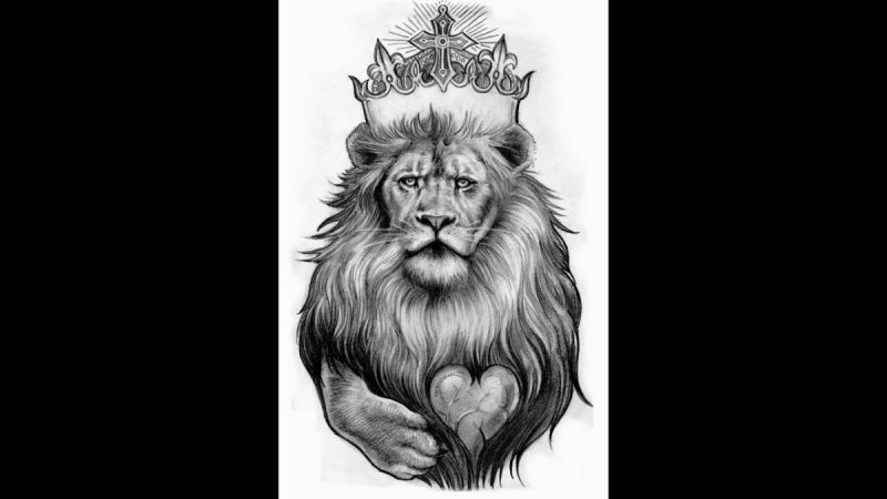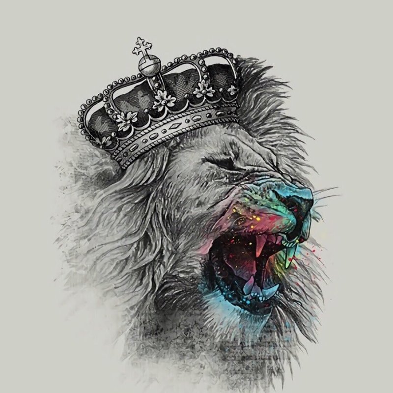 На эскизе изображён величественный лев с короной на голове. Животное представлено в профиль, его мощные лапы уверенно стоят на земле. Корона, расположенная на голове льва, символизирует силу, власть и благородство. Эскиз выполнен в ярких, насыщенных тонах, что подчёркивает царственность и величие образа. Этот рисунок может стать основой для создания герба или логотипа, символизирующего мощь и благородство.