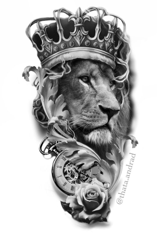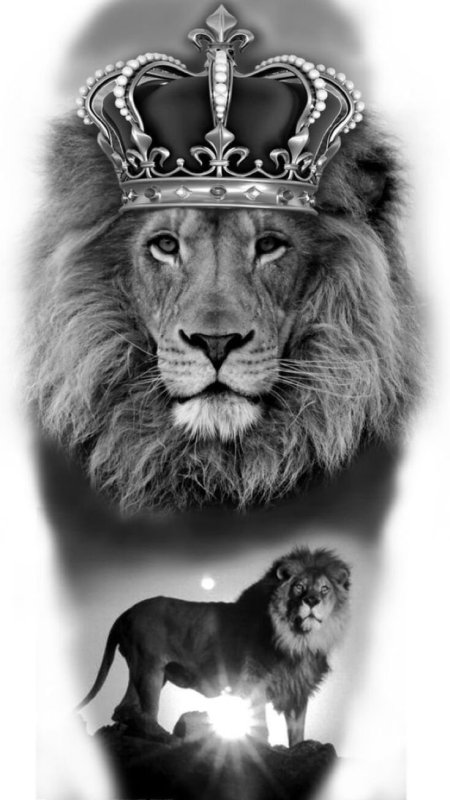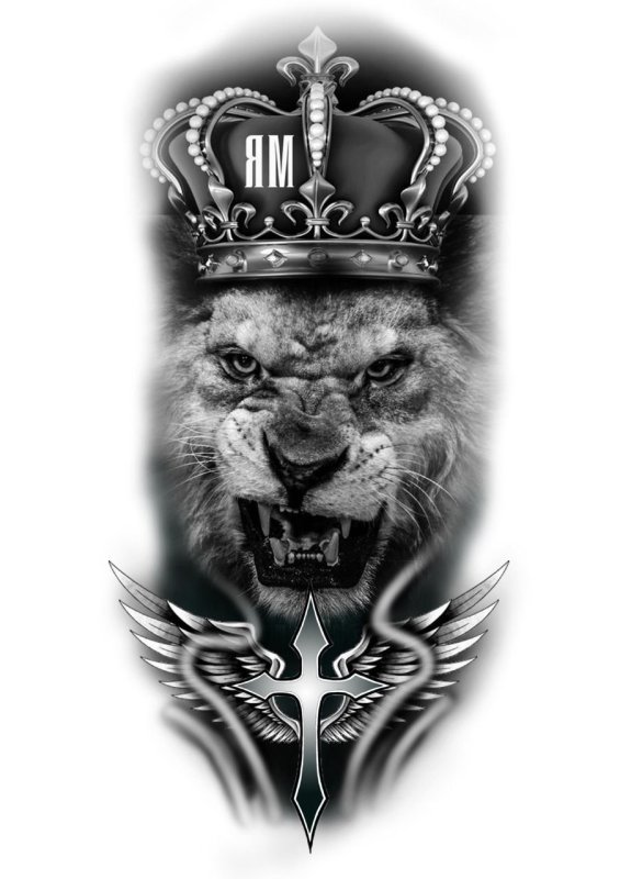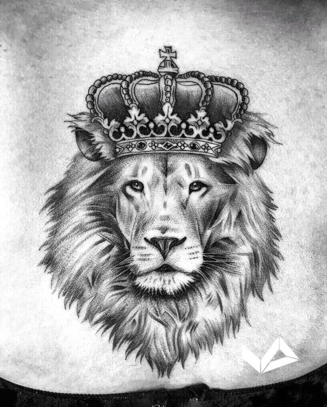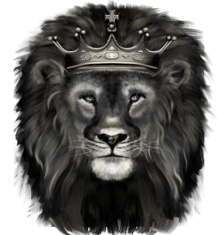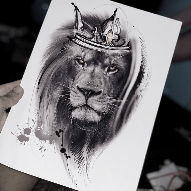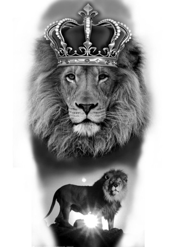На эскизе изображён величественный лев с короной на голове. Животное представлено в профиль, его мощные лапы уверенно стоят на земле. Корона, расположенная на голове льва, символизирует силу, власть и благородство. Эскиз выполнен в ярких, насыщенных тонах, что подчёркивает царственность и величие образа. Этот рисунок может стать основой для создания герба или логотипа, символизирующего мощь и благородство.