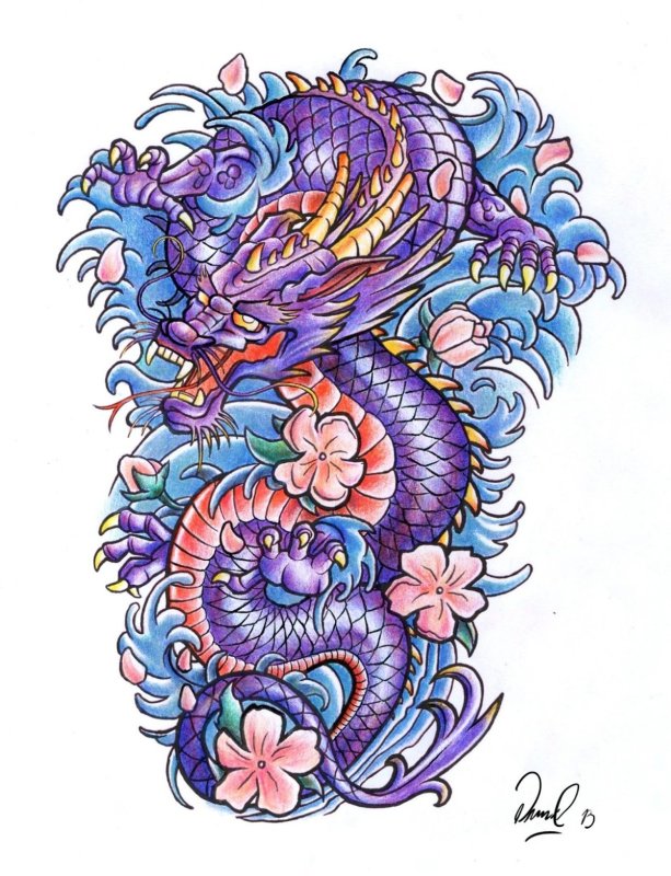 На рисунке изображён величественный дракон с чешуйчатым телом, мощными крыльями и острыми когтями. Его глаза горят огнём, а из пасти вырывается дым. Дракон стоит на задних лапах, словно готов в любой момент взлететь в небо. Этот образ символизирует силу и могущество, вызывая восхищение и трепет.