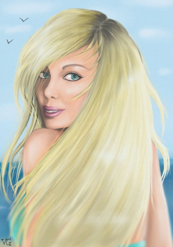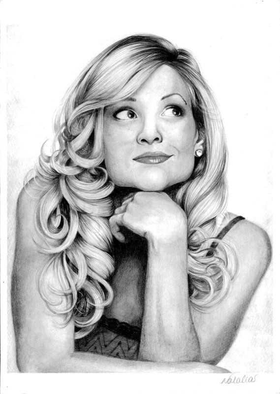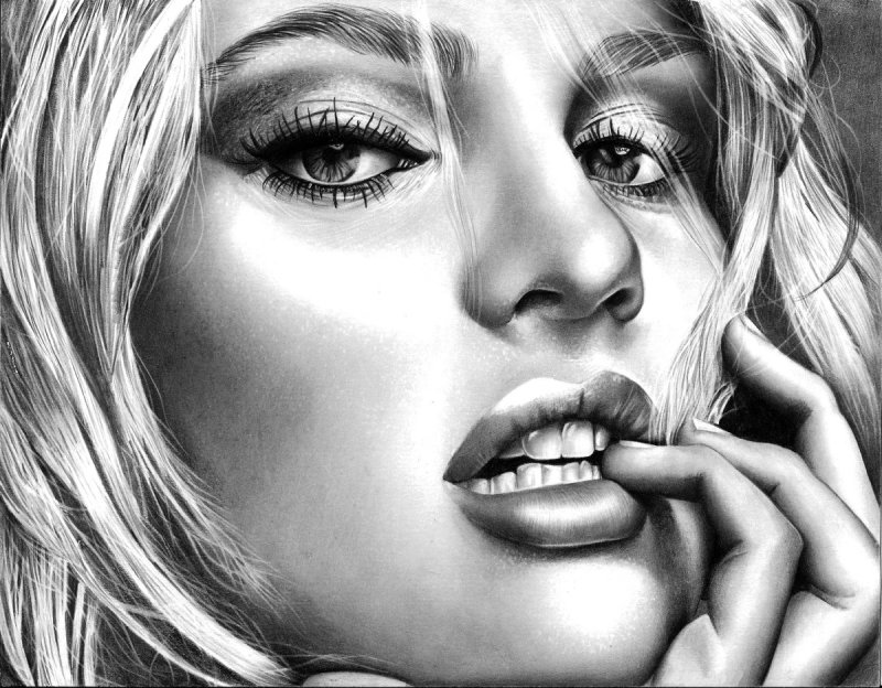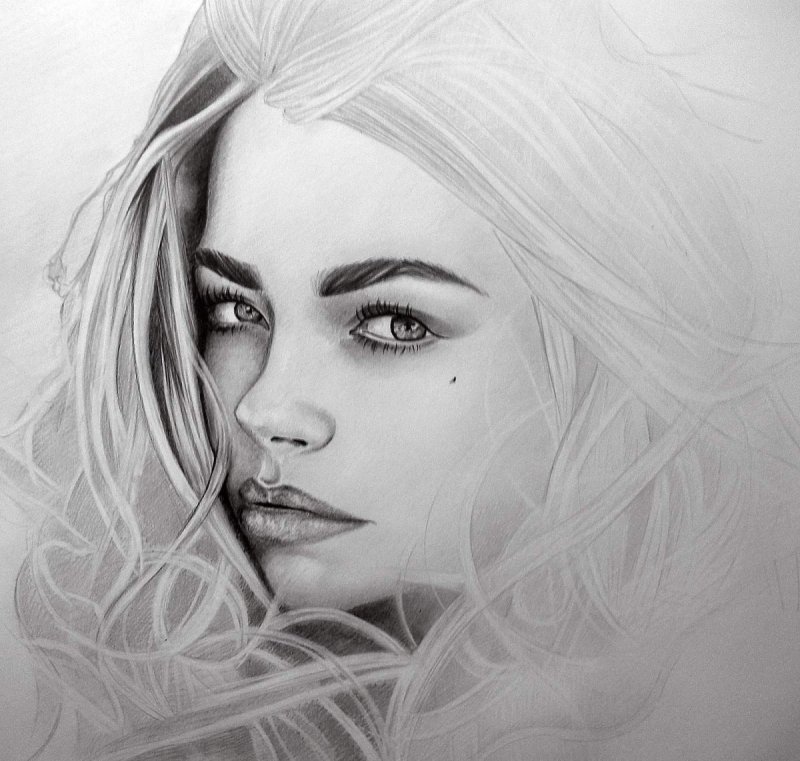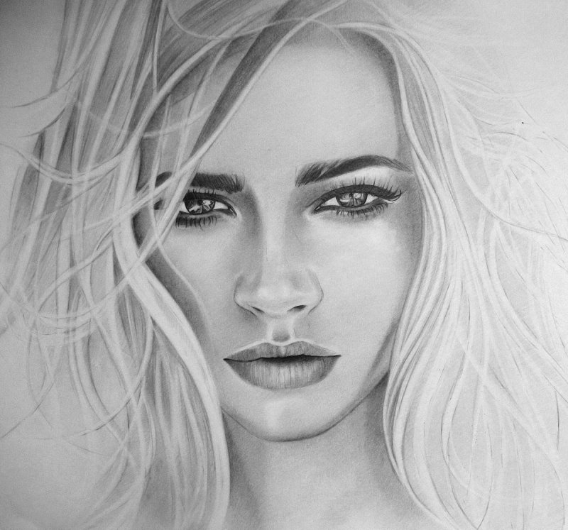 На рисунке изображена блондинка с длинными светлыми волосами, которые мягко обрамляют её лицо. Она смотрит прямо, её черты лица выражают спокойствие и лёгкость. Мягкие тени и плавные линии карандаша создают ощущение объёма и глубины, придавая изображению живость и натуральность. Фон рисунка ненавязчив, что позволяет сосредоточиться на образе блондинки.